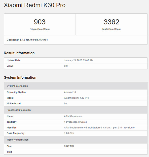 การรายงานล่าสุดพบรายชื่อ Redmi K30 Pro ผ่านการทดสอบจากเว็บชื่อดังอย่าง Geekbench พร้อมเผยให้เห็นสเปกเบื้องต้นที่น่าสนใจ ได้แก่ ชิปเซ็ต Qualcomm Snapdragon 865 พร้อม RAM ขนาด 8GB และระบบปฏิบัติการ Android 10 สำหรับผลทดสอบในด้านการประมวลผลแบบหลายแกน (Multi-Core) อยู่ที่ 3,362 คะแนน และแบบแกนเดี่ยว (Single-Core) ที่ 903 คะแนน