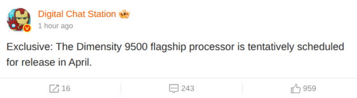ตามข้อมูลจากทิปสเตอร์ Weibo ที่เป็นที่รู้จักอย่าง Digital Chat Station ระบุว่า โปรเซสเซอร์เรือธง Dimensity 9500 ของผู้ผลิตรายหนึ่ง ถูกกำหนดช่วงเวลาเปิดตัวแบบเบื้องต้นไว้ในเดือนเมษายน