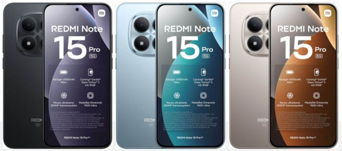 Redmi Note 15 Pro ก็ปรากฏบนหน้าเว็บผู้ให้บริการในเยอรมนีเช่นกัน พร้อมราคาที่แตกต่างกันไปตามสัญญาและรูปแบบแพ็กเกจ ตัวเครื่องมีให้เลือกสามสี ได้แก่ Titanium, Black และ Glacier Blue โดยคาดว่าจะวางจำหน่ายแบบเครื่องเปล่า (ไม่ติดสัญญา) ในราคา 399 ยูโร