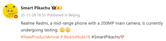 จากข้อมูลดังกล่าว realme และ Redmi กำลังทดสอบสมาร์ตโฟนระดับกลางที่ใช้กล้องหลัก 200MP โดยแฮชแท็ก Redmi Note 16 ที่ปรากฏในโพสต์ของแหล่งข่าวบ่งชี้ว่ารุ่นนี้จะมาพร้อมกล้อง 200MP อย่างไรก็ตาม คาดว่ากล้อง 200MP จะไม่อยู่ในรุ่นมาตรฐาน แต่จะใช้เฉพาะในรุ่น Redmi Note 16 Pro+ และ Redmi Note 16 Pro