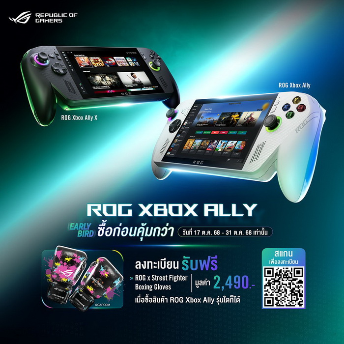นอกจากนี้ ลูกค้าที่สั่งซื้อ ROG Xbox Ally รุ่นใดก็ได้ ในช่วง Early Bird Promotion ระหว่างวันที่ 17-31 ตุลาคม 2568 จะได้รับของพรีเมียมสุดเอ็กซ์คลูซีฟ ที่มีเฉพาะในประเทศไทยเท่านั้น ได้แก่ ROG x Street Fighter Boxing Gloves มูลค่า 2,490 บาท ซึ่งเป็นนวมชกมวยที่ทาง ROG ได้ร่วมมือกับ Capcom จัดทำแคมเปญสุดพิเศษนี้ เพื่อแฟนๆ ชาวเกมในประเทศไทยโดยเฉพาะ ซึ่งได้รับแรงบันดาลใจมาจากตัวละครสกัด (SAGAT) จักรพรรดิมวยไทยจากเกม Street Fighter