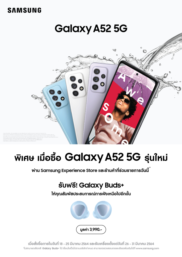 พิเศษ! สำหรับผู้ที่สั่งซื้อ Galaxy A52 5G ระหว่างวันที่ 18-25 มีนาคม 2564 รับฟรีหูฟังไร้สาย Galaxy Buds+ มูลค่า 3,990 บาท พร้อมรับเครื่องในวันที่ 26 มีนาคม – 4 เมษายน 2564 ที่ Samsung Experience Store และร้านค้าที่ร่วมรายการ หรือดูรายละเอียดเพิ่มเติมได้ที่ www.samsung.com/th/smartphones/galaxy-a/