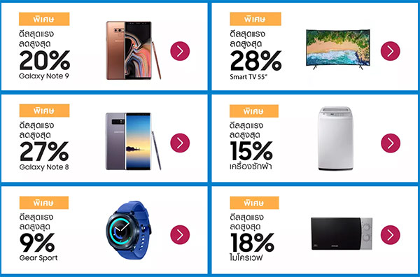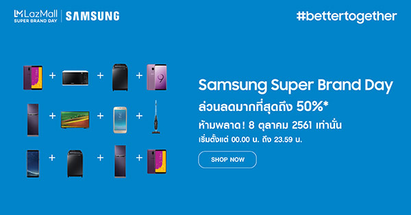 ล่าสุดนี้ทาง Samsung ร่วมกับ Lazada จัดแคมเปญ Samsung x Lazada Super Brand Day เพื่อฉลองครบรอบ 3 ปีการร่วมมือกันของทั้งสองบริษัท พร้อมเอาใจเหล่านักช็อปออนไลน์ด้วยโปรโมชั่นสุดพิเศษสำหรับทุกกลุ่มผลิตภัณฑ์ของ Samsung ไม่ว่าจะเป็น สมาร์ทโฟน, Gadget, โทรทัศน์ และเครื่องใช้ไฟฟ้าในบ้าน แบบ Exclusive ผ่านทาง Lazada ในวันที่ 8 ตุลาคมนี้ วันเดียวเท่านั้น สำหรับตัวอย่างสินค้าที่เป็นไฮไลท์จากแคมเปญดังกล่าวมีดังนี้