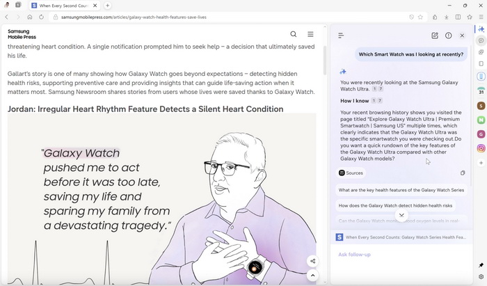- รับรู้บริบทข้ามแท็บ: ผู้ใช้ไม่จำเป็นต้องคลิกเปิดดูแท็บต่างๆ ทีละแท็บเพื่อเปรียบเทียบข้อมูลอีกต่อไป Samsung Browser สามารถสรุปและเปรียบเทียบเนื้อหาจากหลายๆ แท็บได้พร้อมกันในคราวเดียว ทำให้การเข้าถึงข้อมูลเชิงลึกจากแหล่งข้อมูลที่แตกต่างกันในหน้าจอเดียวเป็นเรื่องง่าย