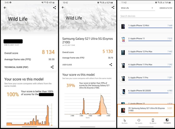 Ice Universe แหล่งข่าวหลุดที่มีความน่าเชื่อถือรายหนึ่ง ได้ออกมาเปิดเผยภาพผลคะแนนทดสอบของชิป Exynos รุ่นใหม่ที่พัฒนาร่วมกับ AMD ซึ่งได้ไปปรากฏตัวบน 3DMark ซึ่งเป็นแอปฯ ทดสอบกราฟิกโดยเฉพาะ ซึ่งก็พบว่า ชิป Exynos รุ่นดังกล่าวทำคะแนนการประมวลผลในด่านทดสอบ Wild Life ไปได้ทั้งหมด 8,134 คะแนน