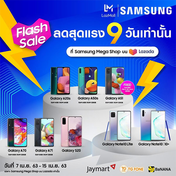 แม้ว่าสถานการณ์ตอนนี้เราไม่สามารถออกไปจับจ่ายใช้สอยได้เหมือนก่อน หลายแบรนด์ต่างก็หันมาเน้นการจัดจำหน่ายผ่านช่องทางออนไลน์กันมากขึ้น ล่าสุดทาง Samsung ได้ร่วมกับทาง Lazada ออกแคมเปญ Flash Sale มือถือรุ่นเด่นราคาพิเศษ ตั้งแต่ในระดับเรือธงไปจนถึงระดับเริ่มต้น และอุปกรณ์เสริมแบบครบครัน