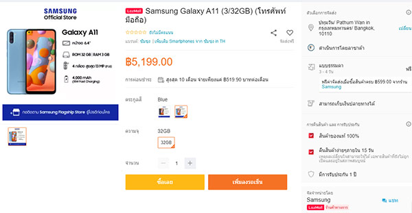 Samsung Galaxy A11 วางจำหน่ายทางการในราคา 5,199 บาท ผ่านช่องทางออนไลน์ที่ Lazada กับตัวเลือก 2 สี ได้แก่ สีดำ และสีฟ้า พร้อมโปรโมชั่นผ่อน 0% นาน 10 เดือน
