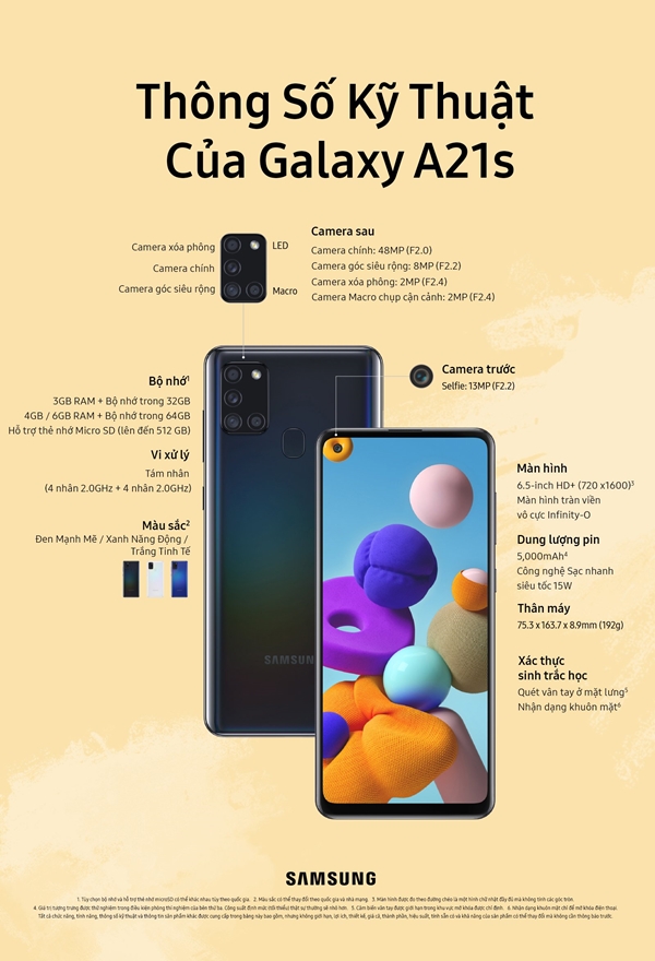 Samsung Galaxy A21s มาพร้อมกับจุดเด่นด้านหน้าจอแสดงผลแบบเจาะรูขนาด 6.5 นิ้ว ความละเอียดระดับ HD+ บนดีไซน์แบบ Infinity-O Display ที่ด้านหลังของตัวเครื่องมาพร้อมกับบอดี้โค้งมนที่มีการเล่นสีสันคล้ายกับรุ่นพี่อย่าง Galaxy A51 และ A71 โดยที่ด้านบนติดตั้งชุดกล้องหลัง 4 ตัวความละเอยดสูงสุด 48 ล้านพิกเซล พร้อมเลนส์ถ่ายภาพแบบครอบคลุมทุกระยะ ด้านประสิทธิภาพการทำงาน ขับเคลื่อนด้วยชิปเซ็ต Exynos 850 ความเร็ว 2.0Hz พร้อมแบตเตอรี่ขนาด 5000mAh ที่รองรับระบบชาร์จเร็ว 15W โดยจะรันด้วยระบบปฏิบัติการ Android 10 ตั้งแต่แกะกล่อง โดยคุณสมบัติของ Galaxy A21s สามารถสรุปออกมาได้ดังนี้