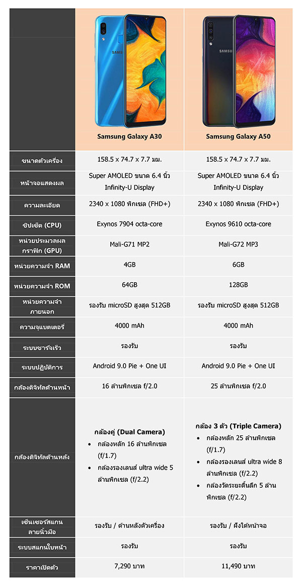 Samsung Galaxy A30 เปิดตัวที่ราคา 7,290 บาท หากจ่ายเพิ่มอีก 4,200 บาท จะได้ Samsung Galaxy A50 ที่มีชิปเซ็ตระดับสูงกว่า, RAM มากกว่า, ความจุภายในมากกว่า, กล้อง 3 ตัวที่มีความละเอียดเพิ่มขึ้น และฟีเจอร์สแกนนิ้วใต้จอ ซึ่งก็นับว่าเป็นส่วนต่างที่สมเหตุสมผล แต่ทั้งนี้ก็ขึ้นอยู่กับสไตล์การใช้งานของผู้ใช้แต่ละท่าน ว่าต้องการคุณสมบัติที่เพิ่มเข้ามานี้มากน้อยแค่ไหนครับ