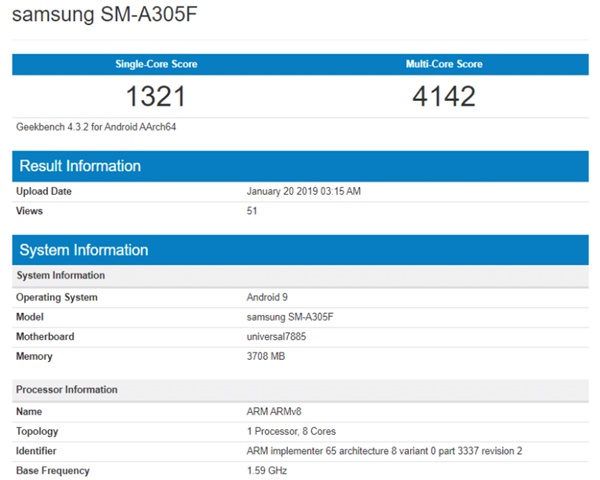 เมื่อไม่นานมานี้ สมาร์ทโฟน Samsung เลขรหัสโมเดล SM-A305F หรือ Galaxy A30 ได้ไปปรากฏอยู่บนฐานข้อมูล Geekbench แหล่งทดสอบประสิทธิภาพสมาร์ทโฟน และแท็ปเล็ตชื่อดัง พร้อมกับเปิดเผยให้เห็นถึงสเปกบางส่วน โดยสมาร์ทโฟนรุ่นดังกล่าวมาพร้อมกับขุมพลัง Exynos 7885 เหมือนกับที่ใช้บน Galaxy A8 (2018) และ Galaxy A8+ (2018) โดยจะทำงานควบคู่กับหน่วยความจำ RAM ขนาด 4GB และรันด้วยระบบปฏิบัติการ Android 9 เวอร์ชันใหม่ตั้งแต่แกะกล่อง