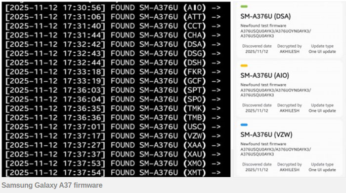 ล่าสุดมีการพบเฟิร์มแวร์ของ Samsung Galaxy A37 บนเซิร์ฟเวอร์ทดสอบของ Samsung โดยระบุว่าเป็นเฟิร์มแวร์ของรุ่น SM-A376U ซึ่งเป็นรหัสสำหรับตลาดสหรัฐอเมริกา นอกจากนี้ยังมีการทดสอบกับผู้ให้บริการเครือข่ายหลักหลายราย เช่น AT&T, Verizon, T-Mobile และ UScellular