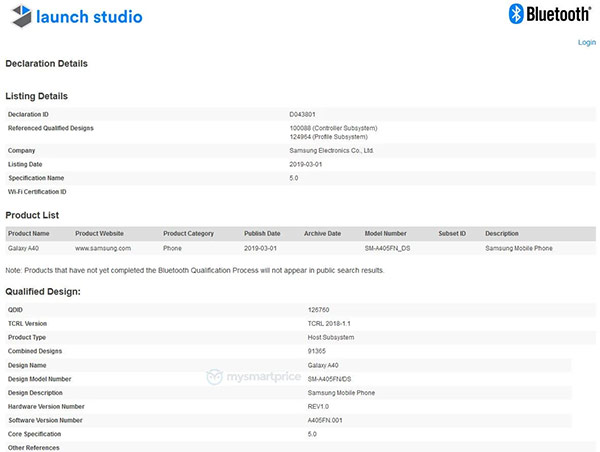 หลังจากการเปิดตัวของสามสมาร์ทโฟนรุ่นต่อยอดจากตระกูล Samsung Galaxy A Series อย่าง Galaxy A50, Galaxy A30 และ Galaxy A10 ในช่วงสัปดาห์ที่ผ่านมา ล่าสุดรายชื่อของ Samsung Galaxy A40 ภายใต้ชื่อรหัส SM-A405FN/DS ได้ผ่านการรับรอง Bluetooth Certification เป็นที่เรียบร้อยแล้ว