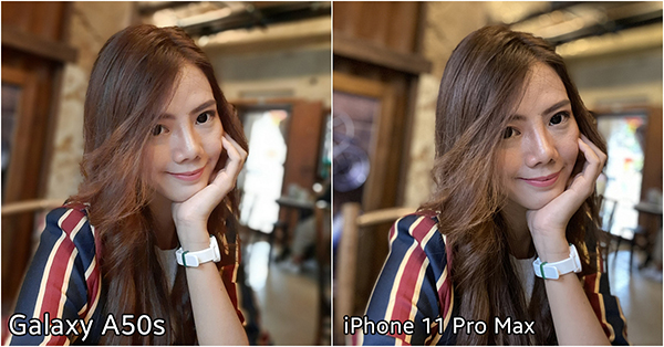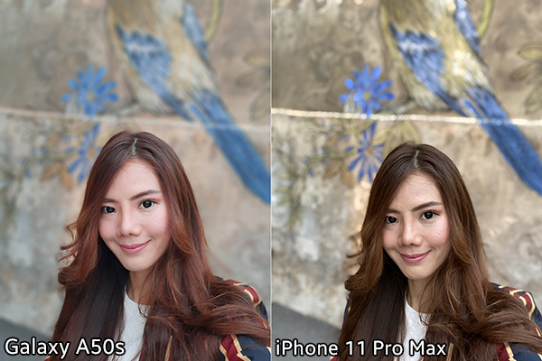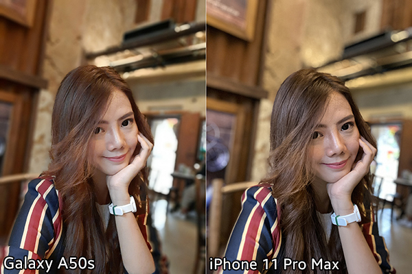 ในส่วนการเบลอฉากหลัง ทั้ง Galaxy A50s และ iPhone 11 Pro Max ทำได้ดีใกล้เคียงกัน แต่ดูเหมือนว่า Galaxy A50s จะตัดขอบเบลอได้ดีกว่าเล็กน้อยบริเวณปอยผมด้านซ้าย ซึ่ง Galaxy A50s สามารถแแยกแยะเส้นผมได้บางส่วน ในขณะที่ iPhone 11 Max Pro เบลอปอยผมไปเกือบหมด