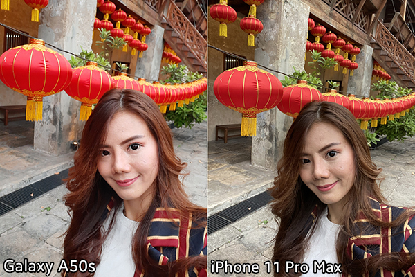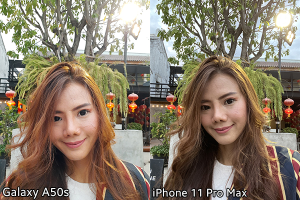ในซีนแรกก็เริ่มเห็นความแตกต่างได้อย่างชัดเจน โดยภาพของ Samsung Galaxy A50s จะมีความสว่าง และมีโทนสีที่สดใสกว่า iPhone 11 Pro Max อย่างเห็นได้ชัด ทำให้ใบหน้าของตัวแบบโดดเด่นยิ่งขึ้น ในขณะที่ภาพของ iPhone 11 Pro Max จะให้โทนสีที่อาจจะดูหม่นกว่าแต่ก็ใกล้เคียงกับสีจริงมากกว่า จุดเด่นของ iPhone ที่สำคัญคือการเก็บรายละเอียดของฉากหลังได้ดี แต่ก็อาจจะทำให้เห็นริ้วรอยบนใบหน้าได้ค่อนข้างชัดกว่า