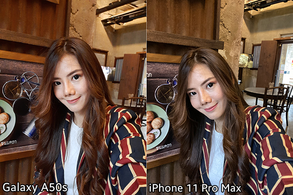 สำหรับการถ่ายภายในอาคารซึ่งมีแสงค่อนข้างน้อย ทั้ง Galaxy A50s และ iPhone 11 Max Pro ทำออกมาได้ดีพอๆ กัน โดยยังคงแตกต่างกันที่โทนสีของภาพเหมือนเดิม ส่วนการเก็บรายละเอียดของภาพในส่วนของตัวแบบถือว่าใกล้เคียงกัน ไม่ว่าจะเป็นเรื่องของ สกินโทน หรือรายละเอียดของแสงเงาต่างๆ แต่ถ้าดูในส่วนของฉากหลัง iPhone 11 Max Pro ก็ถือว่ายังสามารถเก็บรายละเอียดได้ดีกว่าเช่นเดิม