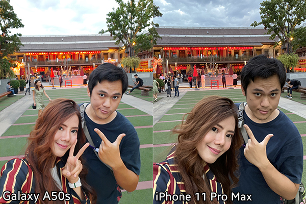 ในซีนนี้ Samsung Galaxy A50s จะได้เปรียบตรงที่มีโหมดการถ่ายรูปมุมกว้างสำหรับกล้องหน้า ทำให้ถ่ายเซลฟีเป็นกลุ่มได้สะดวกมีระยะเลนส์ที่กว้างกว่า และไม่ทำให้ภาพดูอึดอัด ส่วน iPhone 11 Pro Max ยังคงทำได้ดีในส่วนของ HDR โดยยังคงมองเห็นท้องฟ้าได้ชัดเจน และยังสามารถเก็บรายละเอียดของศาลเจ้าด้านหลังได้แต่สกินโทนหรือการปรับความสว่างของใบหน้ายังทำได้ไม่ดีนักจะค่อนข้างคล้ำและซีด โดยเฉพาะบนตัวแบบชาย (ซึ่งก็คือผมเอง T-T)