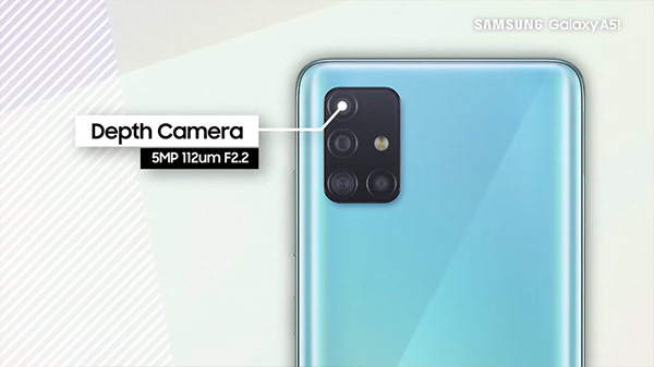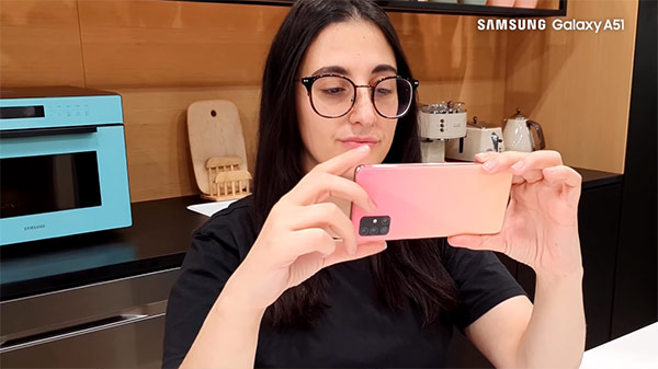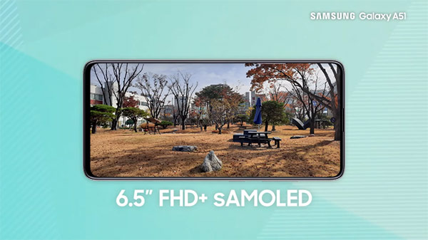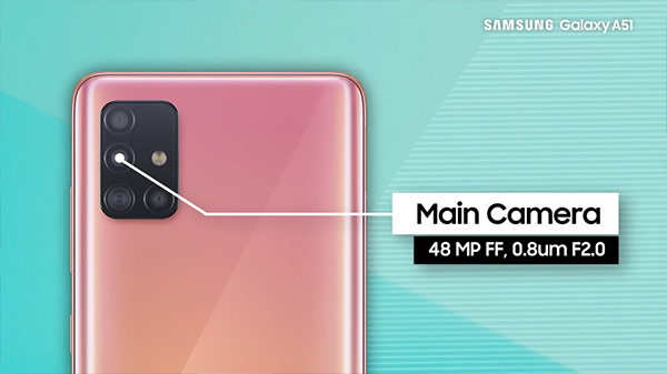 Samsung Galaxy A51 มากับดีไซน์ใหม่ด้วยจอไร้ขอบ ไร้รอยบาก ไร้ติ่ง พร้อมฝังกล้องหน้าบนจอที่ตรงกลางเหมือนกับ Galaxy Note10 และกล้องหลัง 4 ตัว (Quad Camera) เรียงกันเป็นรูปตัว L ในแถบสี่เหลี่ยม บนตัวเครื่องที่มีลวดลายรูปทรงเลขาคณิตแบบ Prism Holographic กับตัวเลือก 4 สี 4 สไตล์