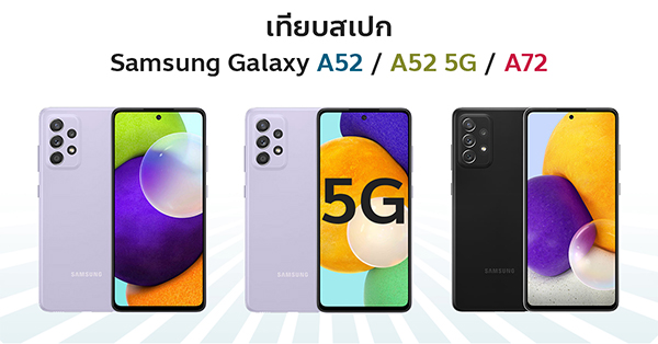 ในที่สุดก็เปิดตัวในบ้านเราไปเรียบร้อยแล้วสำหรับ Samsung Galaxy A52, Galaxy A52 5G และ Galaxy A72 สมาร์ทโฟนซีรีส์ฮิตรุ่นใหม่ล่าสุด ซึ่งคราวนี้ก็มากับสเปกที่โดดเด่นรอบด้าน ในราคาหมื่นต้นๆ เหมือนเดิม สำหรับใครที่กำลังเล็งสมาร์ทโฟนทั้ง 3 รุ่นนี้อยู่ แต่ยังไม่รู้ว่าจะเลือกรุ่นไหนดี ในวันนี้เราได้นำสมาร์ทโฟนทั้ง 3 รุ่นมาเปรียบเทียบสเปกให้เห็นความแตกต่างกันชัดๆ เพื่อให้ทุกท่านได้เลือกรุ่นที่ถูกใจได้ง่ายขึ้นครับ