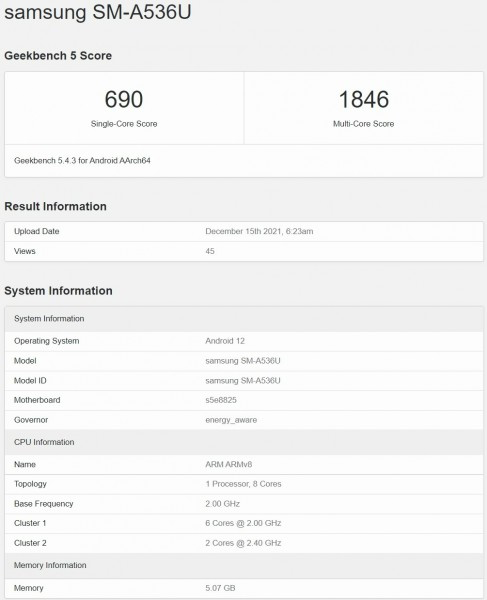 เมื่อไม่นานมานี้ สมาร์ทโฟนเลขรหัสโมเดล SM-A536U หรือที่หลายสื่อคาดว่าเป็น Galaxy A53 5G ได้ไปปรากฏตัวบนฐานข้อมูลทดสอบประสิทธิภาพ CPU ชื่อดังอย่าง Geekbench พร้อมเปิดเผยให้เห็นถึงสเปกเด่นบางส่วน โดยสมาร์ทโฟนรุ่นดังกล่าวมาพร้อมกับจุดเด่นดา้นการได้ใช้ชิปเซ็ตเรือธงอย่าง Exynos 1200 ความเร็วสูงสุด 2.40GHz ทำงานคู่กับหน่ยความจำ RAM ขนาด 6GB และรันด้วยระบบปฏิบัติการ Android 12 รุ่นใหม่ตั้งแต่แกะกล่อง