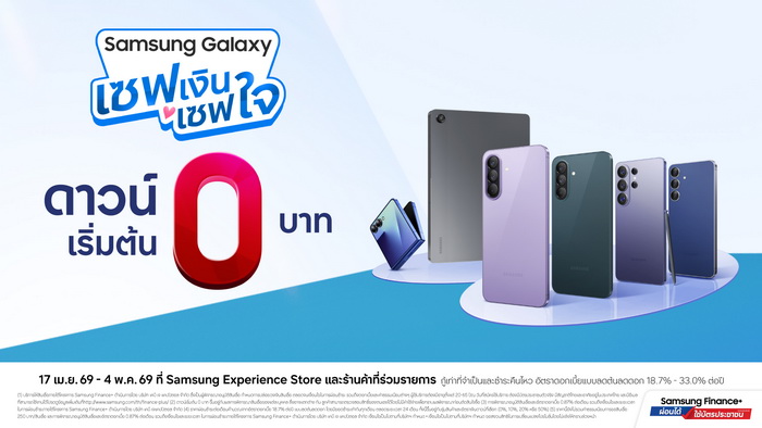 นอกจากนี้ ซัมซุง ยังจัดโปรฯ มาให้เลือกหลากหลายรุ่น ไม่ว่าจะเป็น Galaxy S26 Series, Galaxy S25 FE, Galaxy Z Flip7 Series, Galaxy A57 I A137 5G, Galaxy A17 5G และ Galaxy Tab A11+ ก็รับสิทธิพิเศษ ผ่อน 0% ดาวน์ต่ำสุด ผ่าน Samsung Finance+ เอกสารน้อย อนุมัติไว เริ่ม 17 เมษายน – 4 พฤษภาคม 2569 ที่ Samsung Experience Store และร้านค้าที่ร่วมรายการทั่วประเทศ ดูรายละเอียดโปรโมชันเพิ่มเติมทาง