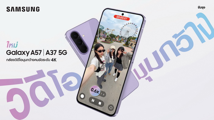 ซัมซุง เปิดตัว Samsung Galaxy A57 5G และ Samsung Galaxy A37 5G รุ่นใหม่ ที่ออกแบบมาเพื่อตอบโจทย์การใช้งานในชีวิตประจำวันมากขึ้น ชูจุดเด่นด้านการถ่ายวิดีโอ 4K มุมกว้างพิเศษ 123 องศา ผ่านเลนส์ Ultra-Wide 12MP พร้อมระยะ 0.6x ที่ช่วยเปิดมุมมองใหม่ให้กับการถ่ายคอนเทนต์ ทั้งภาพบุคคลและภาพหมู่ในเฟรมเดียว ดีไซน์น้ำหนักเบากว่าเดิม 19 กรัม มาพร้อมข้อเสนอพิเศษช่วงเปิดตัว อัปเกรดความจุจาก 256GB เป็น 512GB มูลค่า 3,000 บาท โดยไม่มีค่าใช้จ่ายเพิ่มเติม และตัวเลือกผ่อนชำระผ่าน Samsung Finance+ เพียงใช้บัตรประชาชนใบเดียว