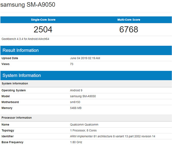 รายชื่อ Samsung Galaxy A90 ภายใต้ชื่อรหัส SM-A9050 ได้ผ่านการทดสอบจากเว็บไซต์ Geekbench พร้อมเผยผลการประมวลผลแบบหลายแกน (Multi-Core) ที่ 6,768 คะแนน และด้านแกนเดี่ยว (Single-Core) ที่ 2,504 คะแนน