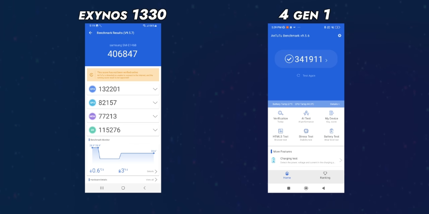 จากการทดสอบโดย TechBar พบว่า Galaxy F14 5G มีประสิทธิภาพสูงทีเดียว โดยสามารถทำคะแนน AnTuTu ได้ที่ 406487 คะแนน สูงกว่า Snapdragon 4 Gen 1 ชัดเจน ส่วน Geenbench 6 ทำคะแนน single-core กับ multi-core ได้ 973 และ 2159 ตามลำดับ
