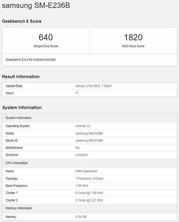 รายชื่อของ Samsung Galaxy F23 5G ชื่อรหัส SM-E236 ได้ปรากฎบนเว็บทดสอบประสิทธิภาพสมาร์ทโฟนอย่าง Geekbench ซึ่งเผยให้เห็นสเปกบางส่วน ได้แก่ ชิปเซ็ต Qualcomm Snapdragon 750G รองรับ 5G พร้อม RAM 6GB และระบบปฏิบัติการ Android 12 โดยมีผลทดสอบการประมวลผลแบบแกนเดี่ยว (Single-Core) ที่ 640 คะแนน และแบบหลายแกน (Multi-Core) ที่ 1,820 คะแนน