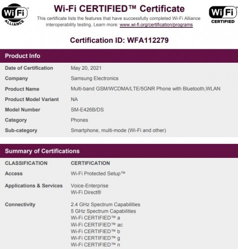 โดยสเปกที่ทาง Wi-Fi Alliance เผยออกมาให้เราได้เห็นนั้น จะเป็นสเปกเกี่ยวกับการเชื่อมต่อเครือข่ายทั้งสิ้น โดย Samsung Galaxy F52 5G รองรับการเชื่อมต่อ Wi-Fi ทั้งแบบ 2.4GHz และ 5GHz ซึ่งถือว่าไม่ใช่เรื่องที่น่าแปลกใจอะไรสำหรับสมาร์ทโฟนในยุคนี้