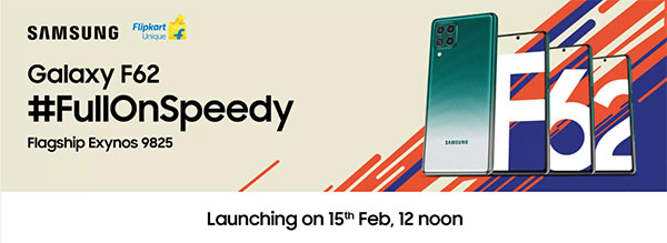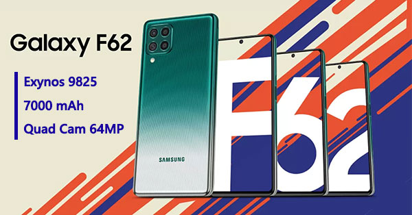 Samsung Galaxy F62 เตรียมเปิดตัวอย่างเป็นทางการในวันที่ 15 กุมภาพันธ์นี้ พร้อมยืนยันว่าจะมากับชิปเซ็ต Exynos 9825 ที่ใช้บน Galaxy Note10 Series บนการดีไซน์จอไร้ขอบ เจาะรูกล้องหน้าที่ตรงกลางแบบ Infinity-O Display และฝาหลังดีไซน์ใหม่ ไล่เฉดสี ที่มีการติดตั้งกล้อง 4 ตัว (Quad Camera) ที่มุบนซ้าย