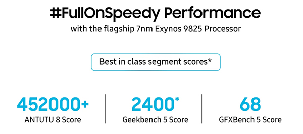 สเปกของ Samsung Galaxy F62 ได้รับการยืนยันจากหน้าผลิตภัณฑ์บนร้านค้าออนไลน์ Flipkart ซึ่งระบุว่าสมาร์ทโฟนรุ่นนี้จะมีหน้าจอแสดงผลแบบ Super AMOLED+, ใช้ชิปเซ็ตประมวลผล Exynos 9825 ซึ่งเป็นรุ่นเดียวกันกับที่ใช้ในเรือธง Galaxy Note10 และแบตเตอรี่ความจุสูงถึง 7,000 mAh