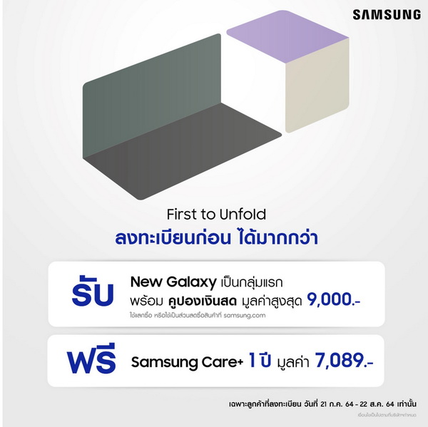ซัมซุงเดินหน้ามอบประสบการณ์พิเศษขั้นกว่า ให้เป็นเจ้าของ The new Galaxy รุ่นล่าสุดก่อนใครกับแคมเปญ “First to Unfold” ที่จะมาชวนกาแลคซี่แฟนร่วมเป็นบุคคลกลุ่มแรกของเมืองไทย เพื่อร่วมก้าวสู่ยุคใหม่ของนวัตกรรมสมาร์ทโฟน เพียงลงทะเบียนผ่านเว็บไซต์ www.samsung.com/th/unpacked ตั้งแต่วันนี้ – 22 ส.ค. 2564 เวลา 23.59 น.[1] พร้อมรับสิทธิพิเศษที่มากกว่า ด้วยคูปองเงินสด มูลค่าสูงสุด 9,000 บาท ใช้แลกซื้อ หรือใช้เป็นส่วนลดซื้อสินค้าที่ samsung.com ในครั้งต่อไป ยิ่งไปกว่านั้น รับฟรี Samsung Care+ เป็นระยะเวลา 1 ปี มูลค่า 7,089 บาท โดยหลังจากที่ลงทะเบียนเป็นที่เรียบร้อยแล้ว กาแลคซี่แฟนจะได้รับโค้ดผ่านทาง E-mail เพื่อนำสิทธิ์ไปสั่งซื้อ The new Galaxy ผ่าน 2 ช่องทางหลักดังนี้