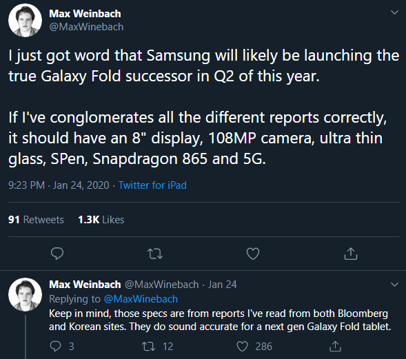 ข้อมูลดังกล่าวมาจาก Max Weinbach แห่ง XDA Developers ซึ่งระบุว่า สมาร์ทโฟนทายาท Samsung Galaxy Fold ตัวจริงกำลังอยู่ในระหว่างการพัฒนา โดยเป็นคนละรุ่นกับ Galaxy Z Flip โดยรุ่นนี้จะมีลักษณะการพับแบบแนวนอนเหมือนกับ Galaxy Fold รุ่นแรก มีหน้าจอแสดงผลขนาด 8 นิ้วเมื่อกาง พร้อมครอบทับด้วยกระจกบางพิเศษ Ultra Thin Glass ซึ่งเรียบเนียนและทนทานกว่าแผ่นฟิล์มในรุ่นแรก กล้องหลังอาจมีความละเอียดสูงถึง 108 ล้านพิกเซล และมาพร้อมปากกา S Pen ตัวเครื่องขับเคลื่อนด้วยชิปเซ็ต Qualcomm Snapdragon 865 รุ่นท็อป และรองรับเครือข่าย 5G คาดว่าจะเปิดตัวในไตรมาสที่ 2 ของปีนี้