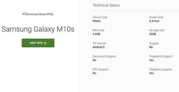 Samsung Galaxy M10s มาพร้อม #IMPOERD และชูโรงที่หน้าจอ Super AMOLED แบบ Infinity-V Display นอกจากนี้รายชื่อของ Galaxy M10s ยังไปปรากฎอยู่บนเว็บไซต์ Android ด้วยเช่นกัน โดยมีการระบุสเปกในบางส่วนไว้อย่างชัดเจน ได้แก่ หน้าจอแสดงผลขนาด 6.4 นิ้ว, หน่วยความจำแรม (RAM) ขนาด 3GB, หน่วยความจำภายในตัวเครื่อง (ROM) ขนาด 32GB และระบบปฏิบัติการ Android 9.0 Pie