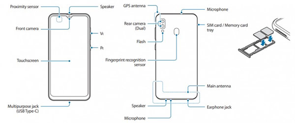 - หน้าจอแสดงผล Super AMOLED Infinity-V Display ขนาด 6.4 นิ้ว คมชัดระดับ HD+ (720x1560 พิกเซล) ในอัตราส่วน 19:9