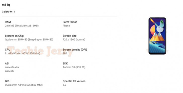 Samsung Galaxy M11 มีหน้าจอแสดงผลความละเอียด HD+ (1560x720 พิกเซล) เป็นสมาร์ทโฟนระดับ entry-level ที่ใช้ชิปเซ็ต Snapdragon 450 พร้อมหน่วยความจำ RAM 3 GB และมากับระบบปฏิบัติการ Android 10 ครอบทับด้วย One UI 2.0 ตั้งแต่แกะกล่อง นอกจากนี้ Samsung Galaxy M11 ยังได้ผ่านการรับรองจาก Wi-Fi Alliance ตั้งแต่เดือนมกราคมที่ผ่านมา โดยรองรับการเชื่อมต่อ Wi-Fi ความถี่ 2.4 GHz