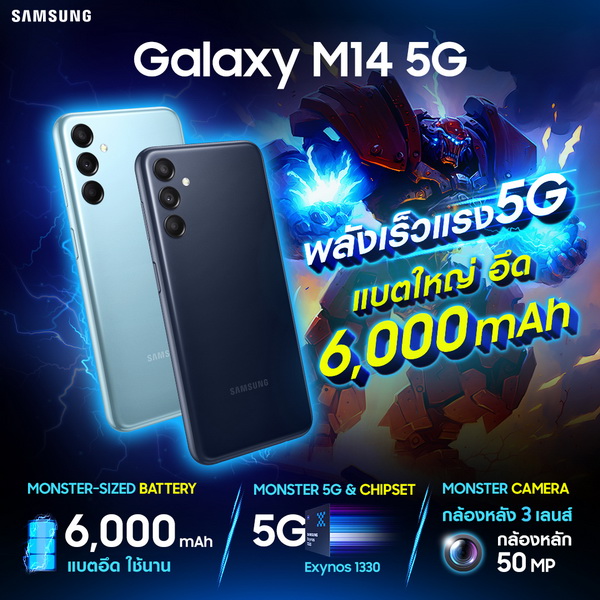 ซัมซุงเปิดตัว Monster ตัวใหม่ อย่าง Samsung Galaxy M14 5G สมาร์ทโฟนราคาเริ่มต้นสุดประหยัดที่มาพร้อมกับ แบตอึดถึง 6,000mAh ใช้งานได้ยาวนานไม่ขาดตอน มาพร้อมกับ 5G ที่เสริมพลังด้วยชิปเซ็ตประมวลผล Exynos1330 เร็วแรงสะใจ ใช้งานได้ไหลลื่นได้นาน ไม่มีสะดุดตอบโจทย์ทุกการใช้งาน ตอกย้ำความเป็น Monster ตัวใหม่ไม่แพ้ใคร กับ 4 พลัง Monster จัดเต็มจุใจในราคาที่คุ้มสุดๆ