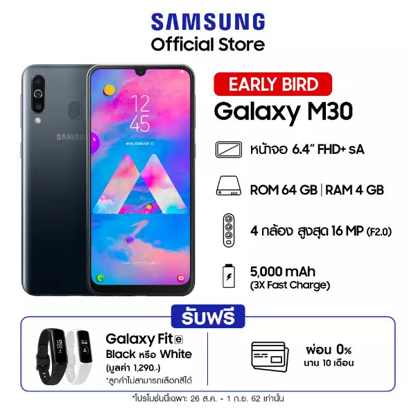 หลังจากการเปิดตัว Samsung Galaxy M30 ในประเทศอินเดียเมื่อไตรมาศแรกที่ผ่านมา ล่าสุด Galaxy M30 ก็พร้อมวางจำหน่ายในประเทศไทยแล้วกับราคาเปิดตัวที่ 6,990 บาท (4GB+64GB) เฉพาะช่องทางออนไลน์ที่เว็บไซต์ Lazada เท่านั้น และพิเศษสำหรับผู้ที่สั่งซื้อในช่วง Early Bird ระหว่างวันที่ 26 สิงหาคม - 1 กันยายนนี้ รับฟรีนาฬิกา Galaxy Fit e มูลค่า 1,290 บาท พร้อมการผ่อนชำระ 0% นานสูงสุด 10 เดือน