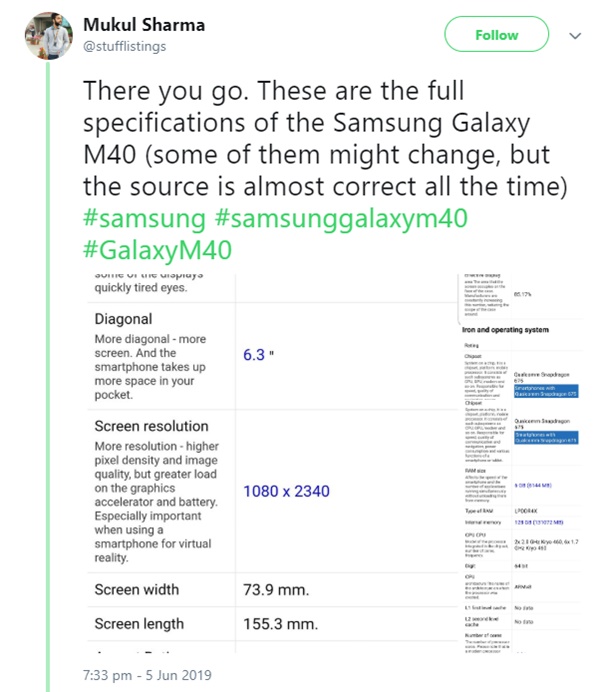 เมื่อไม่นานมานี้ Mukul Sharma แหล่งข่าวแห่งหนึ่งได้เปิดเผยให้ทราบถึงสเปกภายในของ Galaxy M40 ที่ยังไม่เปิดตัวในขณะนี้ให้ได้รับชมกัน โดย Galaxy M40 จะมาพร้อมกับหน้าจอแบบ Super AMOLED ขนาด 6.3 นิ้ว บนความละเอียดระดับ Full HD+ โดยตัวหน้าจอนั้นจะมีความหนานแ่นพิกเซลที่ 409ppi พร้อมอัตราส่วนในการแสดงผลเมื่อเทียบกับตัวเครื่องสูงถึง 85.17% ส่วนทางด้านประสิทธภาพการทำงานขับเคลื่อนด้วยขุมพลัง Snapdragon 675 ตัวใหม่ล่าสุดที่ผลิตด้วยสถาปัตยกรรมระดับ 11 นาโนเมตร ประกบคู่กับหน่วยความจำ RAM แบบ LPDDR4x ขนาด 6GB พร้อมแบตเตอรี่ขนาด 3500mAh และหน่วยความจำภายในความจุ 128GB ที่รองรับหน่วยความจำเสริมแบบ microSD Card