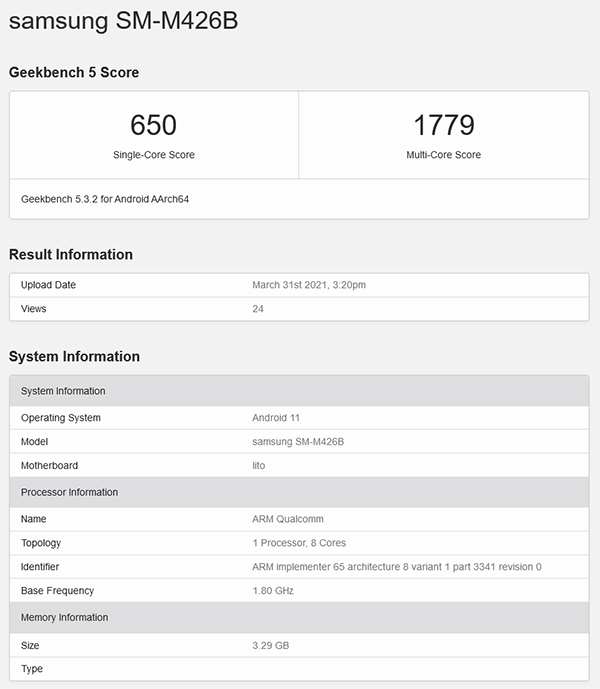 สมาร์ทโฟน Samsung รหัสโมเดล SM-M426B ซึ่งเชื่อว่าเป็น Samsung Galaxy M42 5G ได้ผ่านการทดสอบ benchmark บนแพล็ตฟอร์ม Geekbench 5 โดยทำคะแนนในส่วนการประมวลผลแบบ single-core ได้ 650 คะแนน และแบบ multi-core ได้ 1779 คะแนน ตัวอุปกรณ์มี RAM 4GB และใช้ชิปเซ็ต Qualcomm ความเร็ว 1.8GHz ซึ่งคาดว่าเป็น Snapdragon 750G