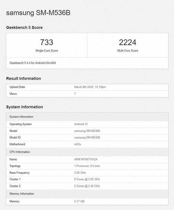 Samsung Galaxy M53 5G ชื่อรหัส SM-M536B ได้ปรากฎอยู่บนเว็บทดสอบประสิทธิภาพชื่อดังอย่าง Geekbench พร้อมเผยให้เหฌนสเปกบางส่วน ได้แก่ ชิปเซ็ต Dimenaity 900 5G, RAM ขนาด 6GB และระบบปฏิบัติการ Android 12 ครอบทับด้วย One UI 4 โดยมีผลทดสอบการประมวลผลแบบแกนเดี่ยว (Single-Core) ที่ 733 คะแนน และแบบหลายแกน (Multi-Core) ที่ 2,224 คะแนน