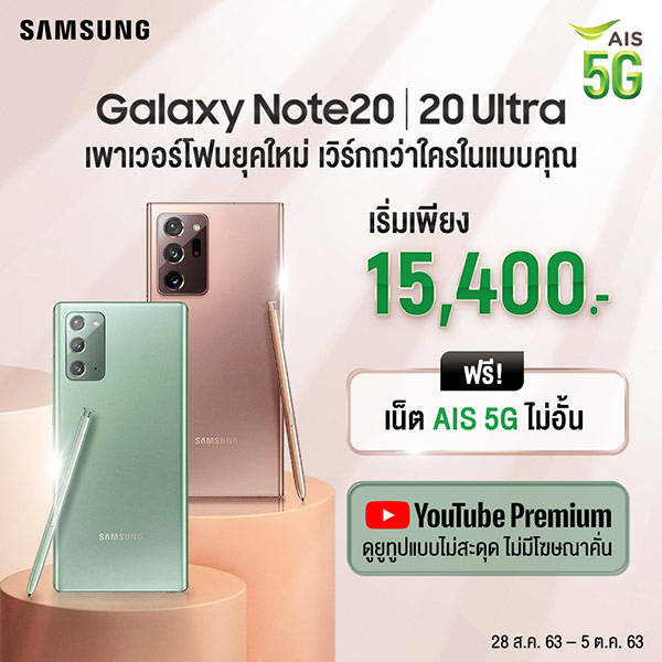 Samsung Galaxy Note 20 | Note 20 Ultra พิเศษเริ่มเพียง 15,400 บาท จาก AIS พร้อมผ่อน 0% นานสุด 40 เดือน และดู Youtube ฟรี แบบไม่มีโฆษณาคั่น 6 เดือน