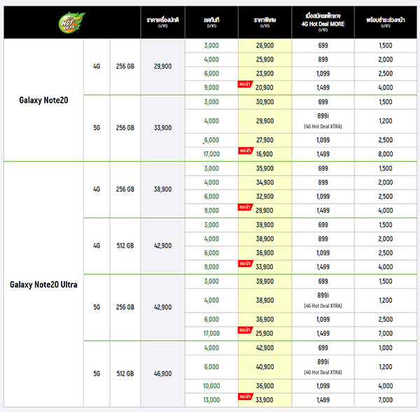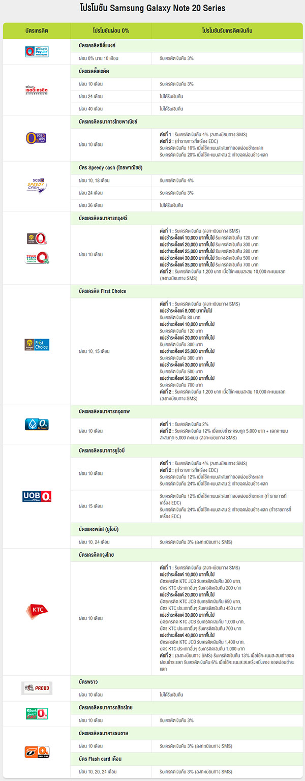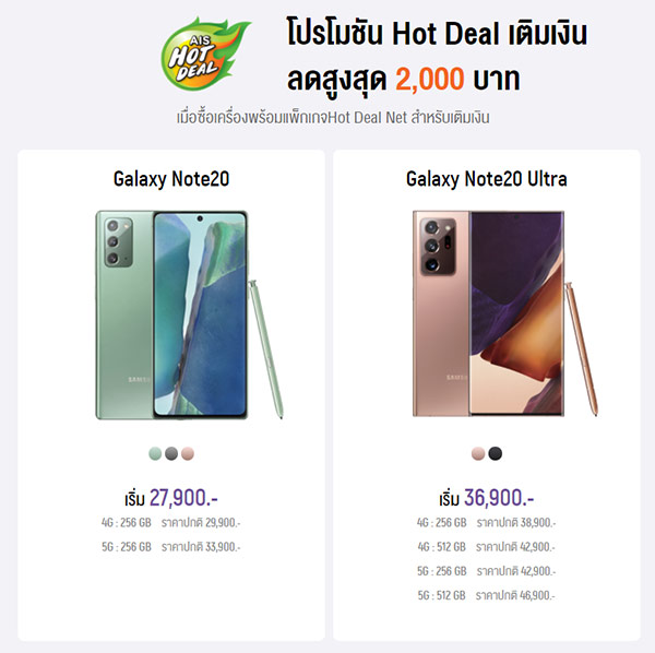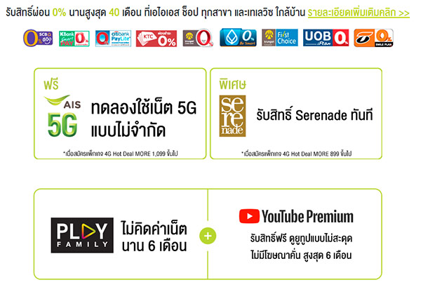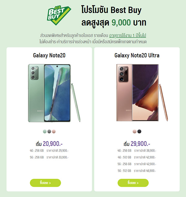 ท่านที่สั่งซื้อ Samsung Galaxy Note 20 Series จากทาง AIS รับสิทธิ์ผ่อนชำระแบบ 0% นานสูงสุด 40 เดือน พร้อมทดลองใช้อินเทอร์เน็ต 5G แบบไม่จำกัด เมื่อสมัครแพ็กเกจ 4G Hot Deal MORE 1,099 บาทขึ้นไป และรับสิทธิ์ Serenade ทันที เมื่อสมัครแพ็กเกจ 4G Hot Deal MORE 899 บาทขึ้นไป รวมถึงชมภาพยนตร์/ซีรีส์ผ่านแอปพลิเคชัน AIS FAMILY ไม่เสียดาต้านาน 6 เดือน และรับสิทธิ์ใช้บริการ Youtube Premiem แบบไม่มีโฆษณาคั่น นานสูงสุด 6 เดือน