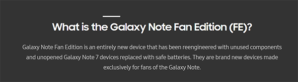 มาต่อกันที่ Samsung Galaxy Note FE บ้าง ทางซัมซุงระบุไว้อย่างชัดเจนว่า "Galaxy Note FE เป็นสมาร์ทโฟนที่มีส่วนประกอบใหม่ทั้งหมด ไม่ใช่การเอา Note 7 มาเปลี่ยนชิ้นส่วน" โดย Galaxy Note FE เป็นการนำเอาชิ้นส่วนที่ "ยังไม่ได้ใช้งาน" มาประกอบขึ้นใหม่ พร้อมทั้งเปลี่ยนแบตเตอรี่ใหม่ด้วย จึงไม่ใช่เครื่อง Refurbished แต่อย่างใด แต่เป็นเครื่องใหม่ และใช้ชิ้นส่วนใหม่ทั้งหมด