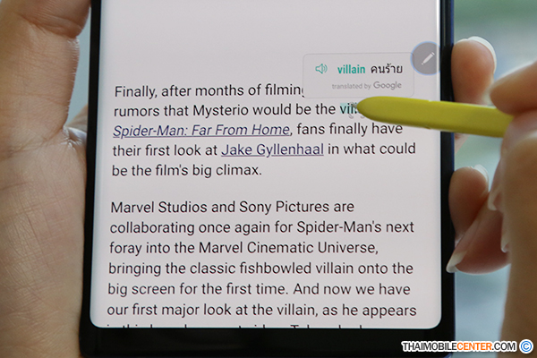 การแปลภาษาบนหน้าเว็บไซต์ต่างๆ บน Galaxy Note 9 สามารถทำได้อย่างง่ายดาย เพียงแค่ดึงปากกา S Pen ออกมา แล้วเลือกฟังก์ชัน Translate จากนั้น นำปากกา S Pen ไปจ่อเหนือคำศัพท์ ก็จะทำการแปลเป็นอีกภาษาหนึ่งให้แบบอัตโนมัติ นอกจากนี้ เรายังสามารถให้ Galaxy Note 9 อ่านคำศัพท์ดังกล่าวให้เราฟังได้ด้วยผ่านการกดที่ไอคอนรูปลำโพงทางด้านซ้าย