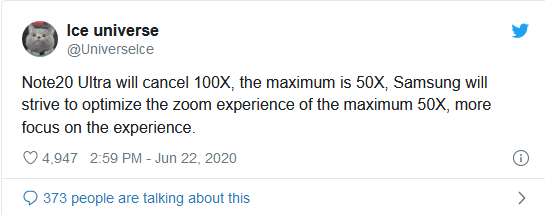 ข้อมูลล่าสุดนี้มาจาก Ice Universe แหล่งข่าวหลุดชื่อดังของวงการ ซึ่งชี้ว่า Samsung จะไม่ใส่ฟีเจอร์ซูม 100x (100x Space Zoom) มาใน Galaxy Note20 Ultra เรือธงตัวท็อปที่กำลังจะเปิดตัวปลายปีนี้ แต่จะลดระยะซูมเหลือ 50x และปรับปรุงคุณภาพของรูปถ่ายขณะซูมให้ดียิ่งขึ้นแทน