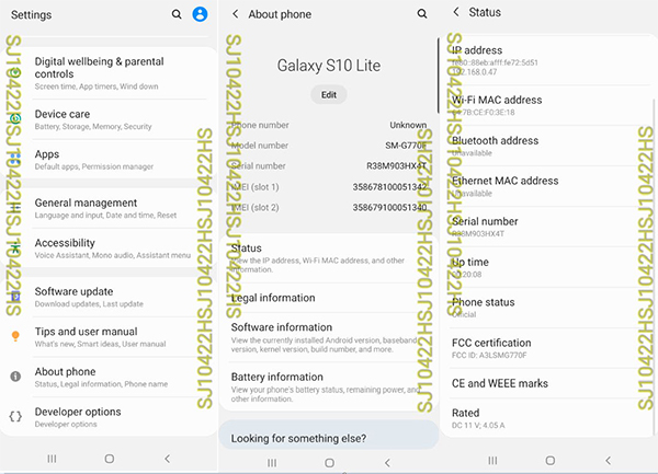 จากภาพสกรีนช็อต ทำให้เราสังเกตเห็นข้อมูลของ Samsung Galaxy S10 Lite ได้บางอย่าง นั่นคือเลย์เอาท์ของอินเทอร์เฟซที่เหมือนกับเลย์เอาท์ของ One UI 2.0 Android 10 beta และการรองรับ 2 ซิมการ์ด, รองรับการเชื่อมต่อ Wi-Fi 6 ซึ่งเป็นมาตรฐานล่าสุด และจะมีรุ่นย่อยอีก 2 รุ่น ได้แก่ SM-G770F/DS, และ SM-G770F/DSM