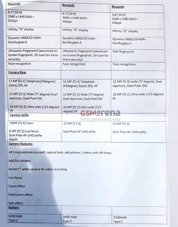 เริ่มต้นที่สเปกกล้องกันก่อน โดยข้อมูลชุดนี้มีเบาะแสมาจากภาพ Spec Sheet ที่ทางเว็บไซต์ GSMArena ได้รับมาจากแหล่งข่าวภายในไม่เปิดเผยชื่อ ซึ่งได้ยืนยันว่า Samsung Galaxy S10 Series ในปีนี้จะมาพร้อมกับกล้องหน้าเซลฟี่ตัวใหม่ความละเอียด 10 ล้านพิกเซล รูรับแสงกว้างสูงสุดที่ f/1.9 พร้อมรองรับการถ่ายวิดีโอที่ความละเอียดระดับ 4K เป็นรุ่นแรกของโลก และที่น่าสนใจคือยังมาพร้อมกับระบบโฟกัสภาพแบบ Dual Pixel ที่ขึ้นชื่อด้านการโฟกัสได้อย่างรวดเร็วเหมือนกับที่ใช้ในกล้องหลัง Samsung ด้วย ส่วนในรุ่น Galaxy S10+ ที่มีข่าวจะมาพร้อมกับกล้องหน้าคู่นั้น กล้องหน้าตัวหลักจะเป็นกล้องความละเอียด 10 ล้านพิกเซลเหมือนกับรุ่นอื่นๆ แต่เสริมกล้องตัวรองความละเอียด 8 ล้านพิกเซล รูรับแสงกว้าง f/2.2 สำหรับช่วยถ่ายภาพเซลฟี่แบบหน้าชัดหลังเบลอมาให้
