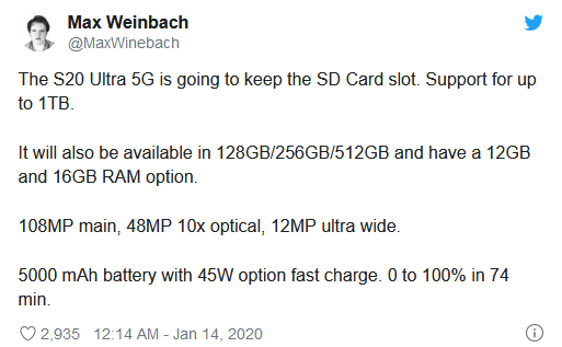 ข้อมูลนี้มาจาก Max Weinbach แห่ง XDA Developers ซึ่งก่อนหน้านี้ก็เพิ่งจะปล่อยภาพถ่ายตัวเครื่อง Galaxy S20+ 5G ไปหมาดๆ โดยครั้งนี้เขาได้เปิดเผยข้อมูลของ Galaxy S20 Ultra 5G เอาไว้หลายส่วนซึ่งสรุปออกมาได้ดังนี้ :