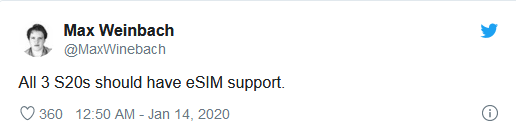 - Galaxy S20 series ทุกรุ่น คาดว่าจะรองรับ eSIM ทั้งหมด ทำให้ใช้งานได้พร้อมกัน 2 ซิม (nanoSIM+eSIM)